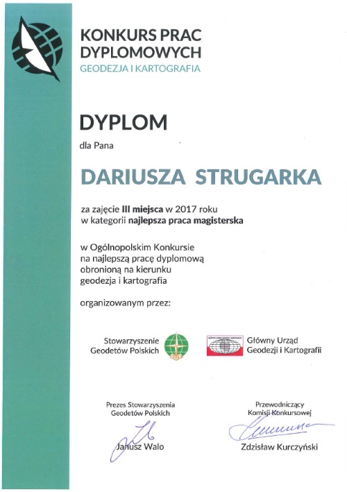 Wyróżniona osoba: Dariusz StrugarekTemat pracy: Analiza porównawcza orbit satelity GOCE opartych na obserwacjach GPS z laserowymi pomiarami odległości SLR