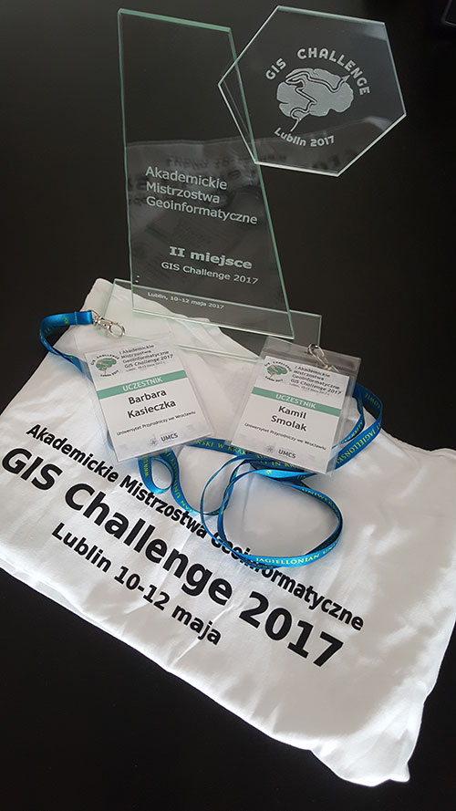 Drużyna dwojga studentów Geodezji i Kartografii - Barbary Kasieczki oraz Kamila Smolaka - zdobyła drugie miejsce spośród 38 zespołów reprezentujących 17 uczelni wyższych z całej Polski. Studenci mieli okazję uczestniczyć w pierwszej edycji tego rodzaju mistrzostw zorganizowanych przez Uniwersytet Marii Curie-Skłodowskiej w Lublinie w dniach 10-12 maja 2017 (http://gischallenge.com). W imprezie wzięły udział cztery zespoły reprezentujące naszą Uczelnię, z czego dwa zakwalifikowały się do finałowej dziesiątki.