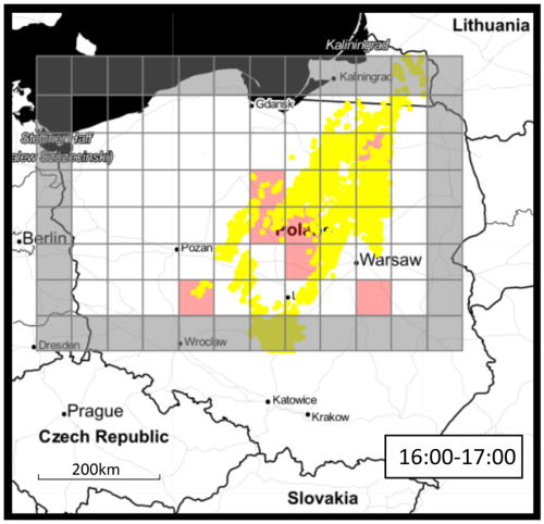 Rysunek 2. Mapa wyładowań (żółte punkty) na tle prognozowanych obszarów wyładowań (czerwone kwadraty).