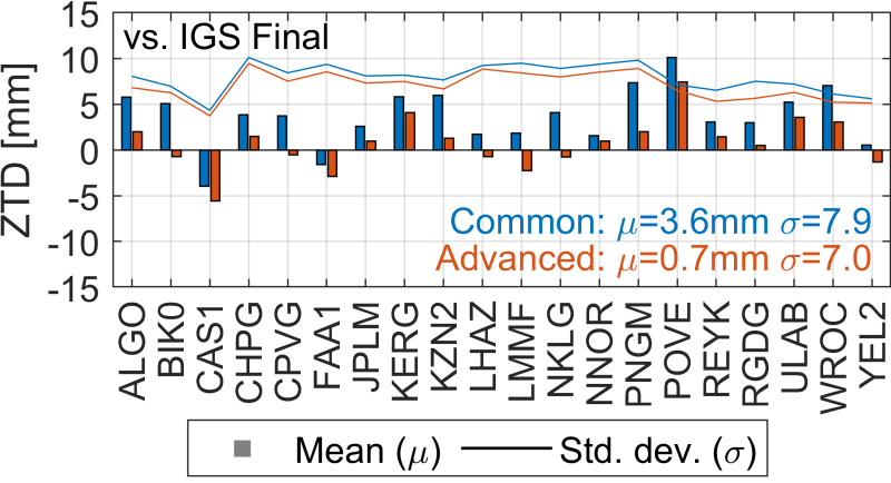 Znaczący rozwój systemów GNSS, na który składa się przede wszystkim budowa nowych konstelacji, dostępność precyzyjnych produktów satelitarnych w czasie rzeczywistym, czy zaawansowane funkcje mapujące troposferę, mają pozytywny wpływ na dokładność estymowanego ZTD. Jednakże poszczególne osiągnięcia nie zostały wykorzystane jednocześnie w meteorologii GNSS czasu rzeczywistego. W związku z tym Hadaś i in. (2020) zbadali jaki wpływ na dokładność wyznaczenia ZTD mają poszczególne parametry strategii obliczeniowej, tj. model funkcjonalny, kombinacja systemów GNSS, wagowanie międzysystemowe, funkcje wagujące ze względu na wysokość satelity nad horyzontem, estymacja gradientów troposferycznych. W ten sposób udało się zdefiniować strategię dedykowaną meteorologii GNSS czasu rzeczywistego, która łączy różne osiągnięcia z zakresu opracowania obserwacji GNSS. Chociaż wykazano, że wszystkie systemy mogą dostarczać niezależnych produktów troposferycznych, kombinacji obserwacji GNSS z różnych systemów z użyciem opracowanej strategii pozwala zmniejszyć odchylenie standardowe estymowanego ZTD nawet o 37%. Dokładność ZTD wyznaczonego w czasie rzeczywistym mieście się w przedziale 5.4 mm do 10.1 mm, co uzasadnia ich asymilację do numerycznych modeli prognozy pogody.