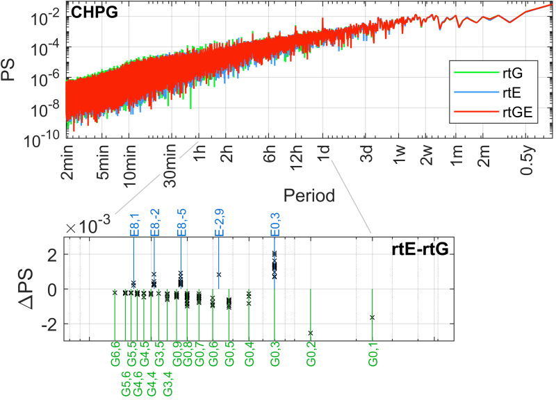 Rys. 2. Periodogramy ZTD (góra) oraz maksyma w różnicowym widmie częstotliwości pomiędzy rozwiązaniem czasu rzeczywistego dla GPS i Galileo wraz z wybranymi okresami oczekiwanych, sztucznych sygnałów orbitalnych dla GPS (zielony) i Galileo (niebieski) (dół)