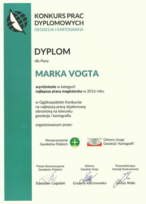 Wyróżniona osoba: Marek VogtTemat pracy: Analiza metodyki wyznaczania okultacyjnych satelitarnych sondaży troposferycznych (GNSS RO)